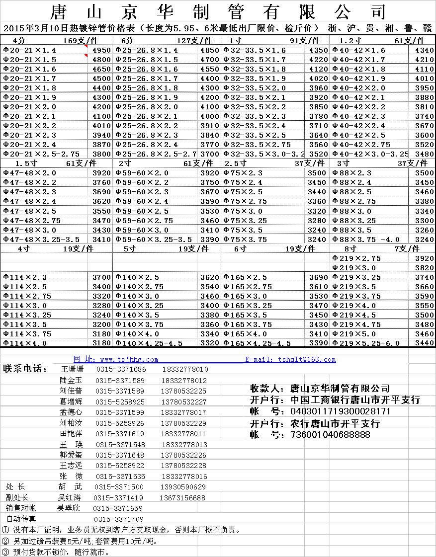 唐山京华2015年3月10日热镀锌管价格表(长度为5.95、6米最低出厂限价、检斤价)