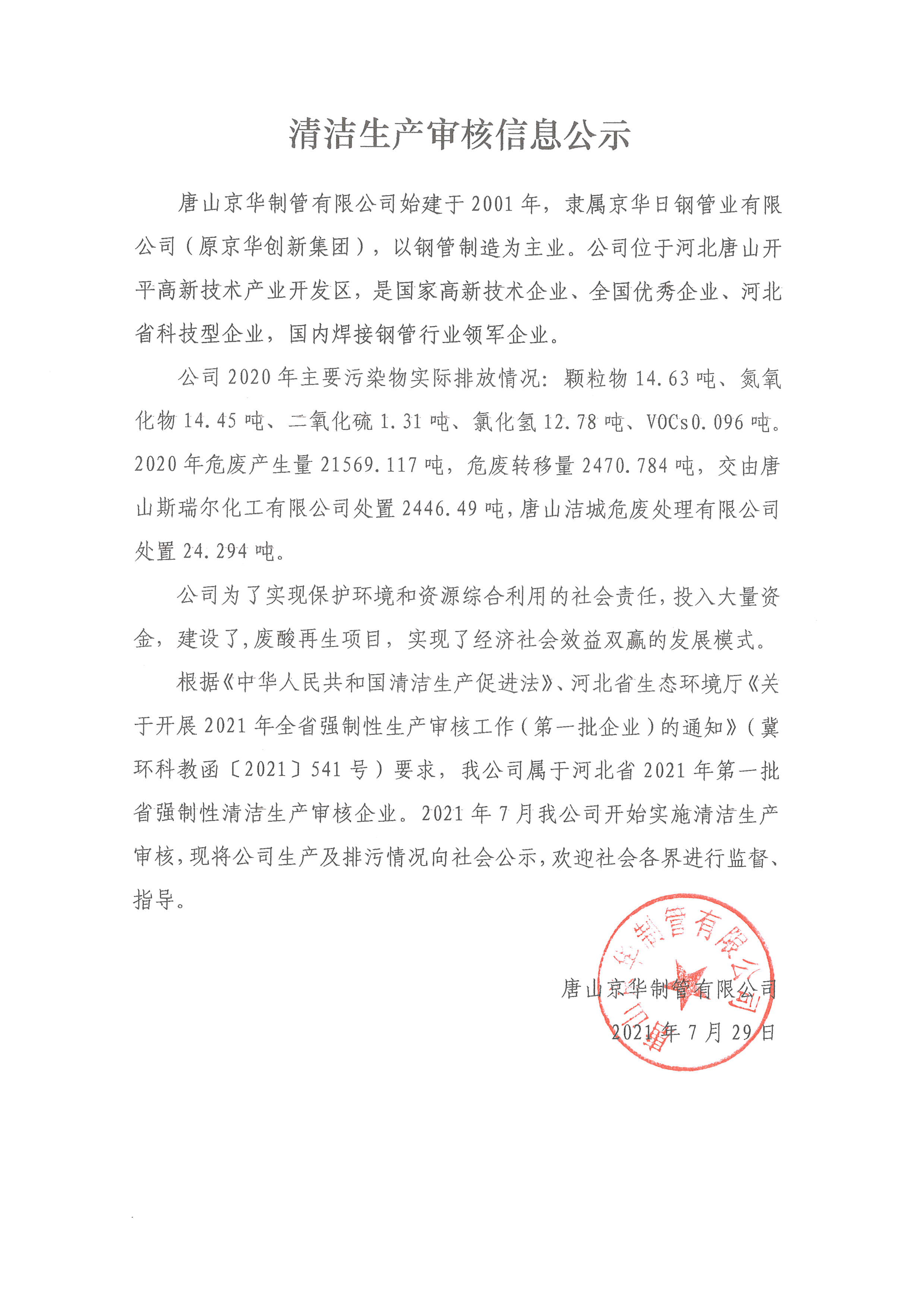 唐山京华危险废物污染环境防治主体责任承诺书