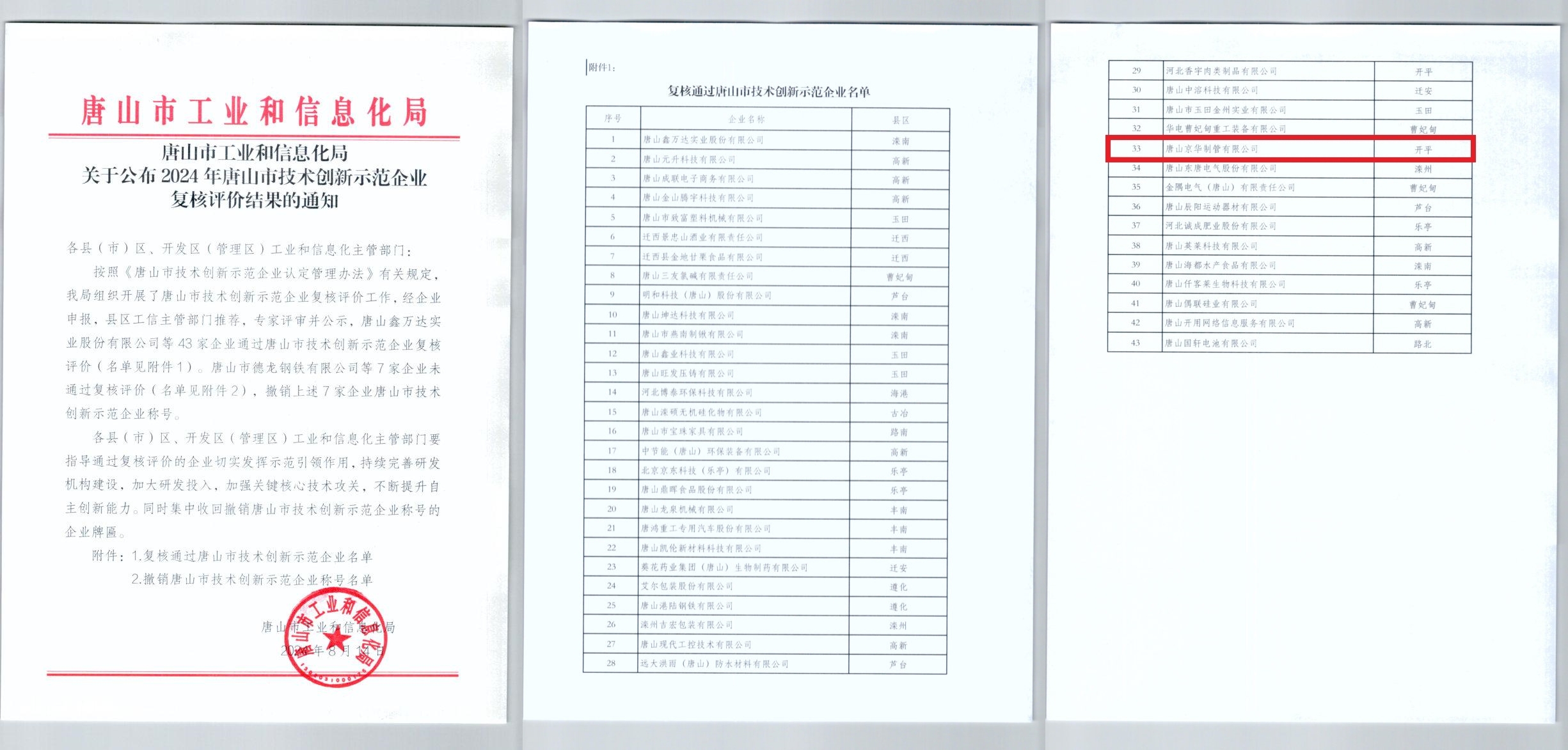 唐山京华顺利通过唐山市技术创新示范企业复评